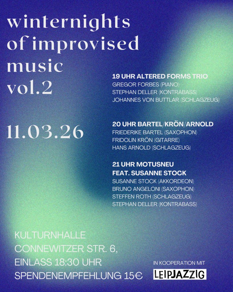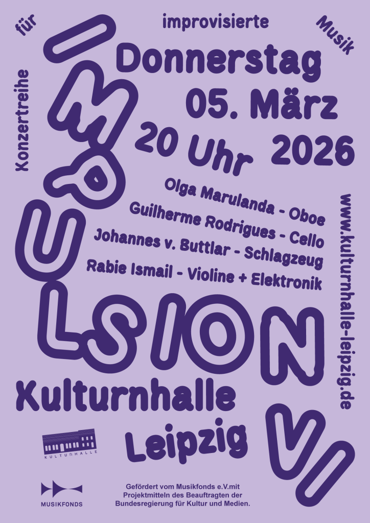 Am 22. Oktober startet die neue Reihe für experimentelle Musik in der Kulturnhalle Leipzig. In der Reihe geht es um Improvisation und Begegnungen. Lokale, Überregionale und Internationale KünstlerInnen kommen über das Medium der Freien Improvisation zusammen und in einen Austausch.